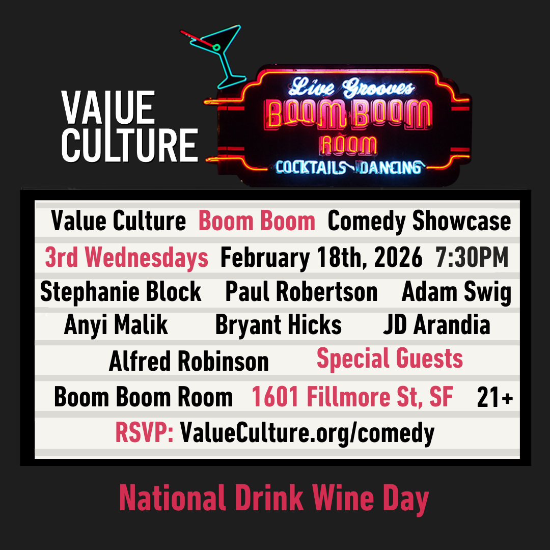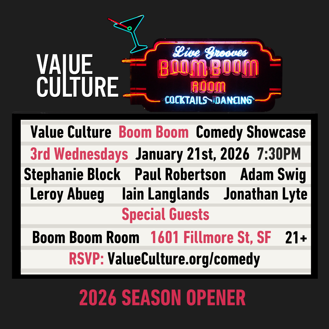 Join us for the always anticipated monthly and highly regarded Value Culture BOOM BOOM Comedy Showcase at the famous Boom Boom Room on Fillmore Street since 2023!
