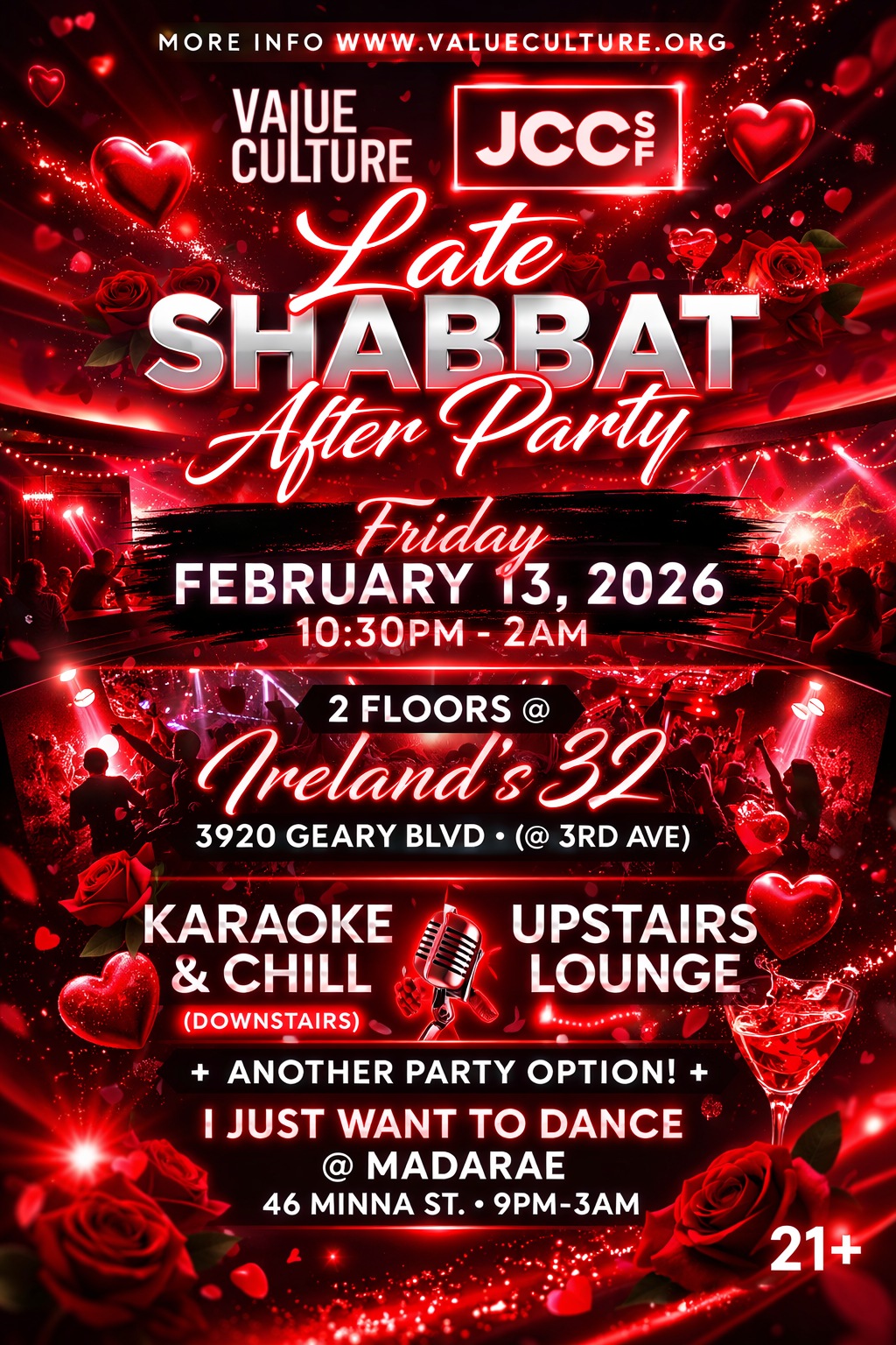 L'chaim! Keep it going after this month's Late Shabbat or wherever you are- head to Ireland's 32 (Geary & 3rd) for an after party beginning at 10pm-11pm. It's free to attend and a short 5 minute walk from the temple.